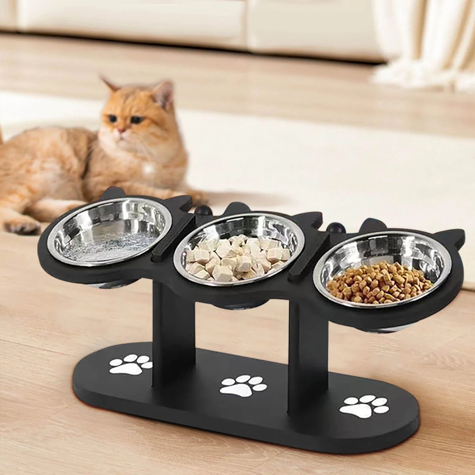 Os potes são feitos de aço inoxidável de qualidade alimentar ou seja garantem higiene e segurança — A base é estável, evita bagunça, e os três potes permitem separar água, ração e petiscos com facilidade.