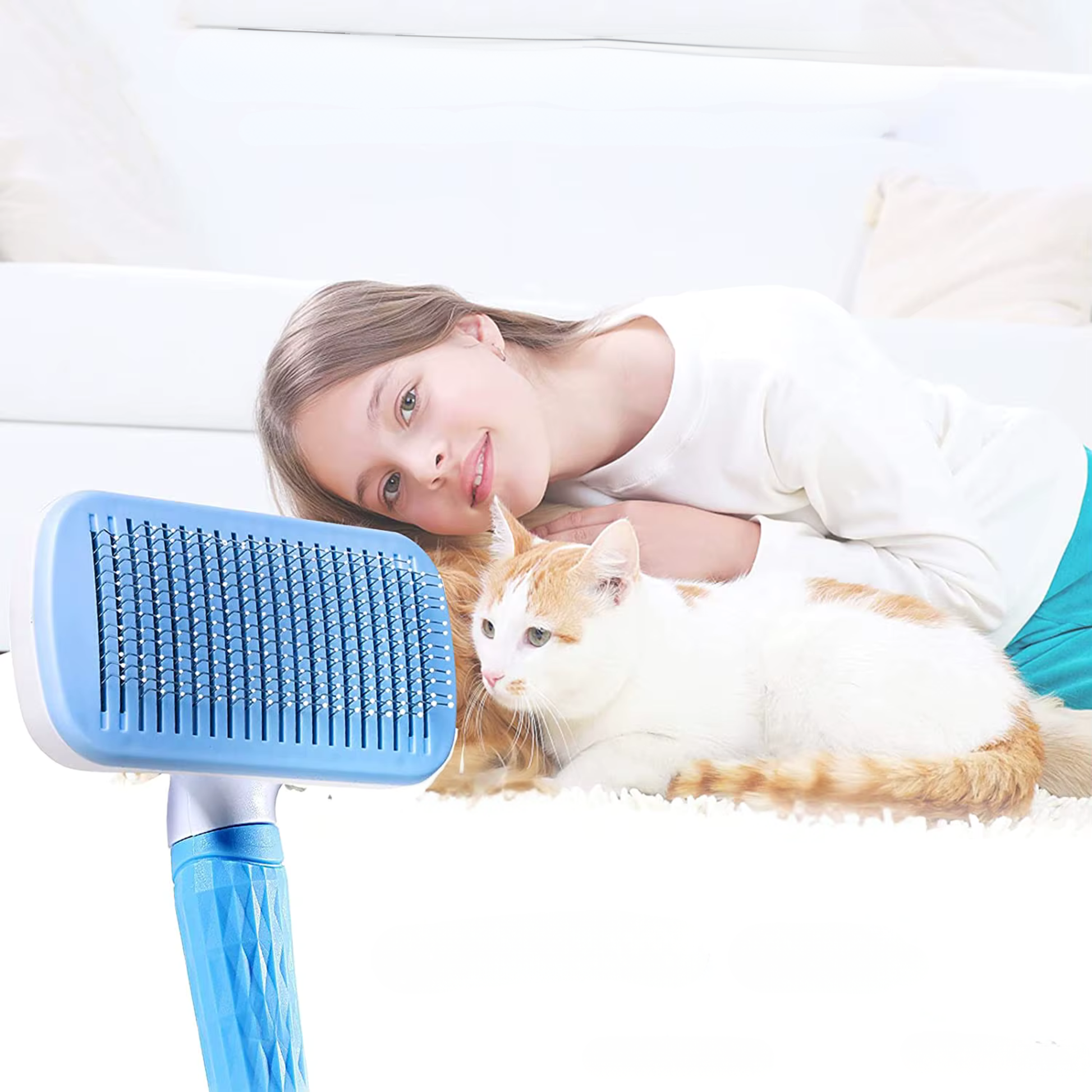 As cerdas de aço inoxidável deslizam facilmente pelo pelo, removendo nós e pelos soltos com precisão — Sem puxões e sem irritação. E o botão autolimpante faz a limpeza por você: apertou, os pelos saem e está pronto para uso novamente.